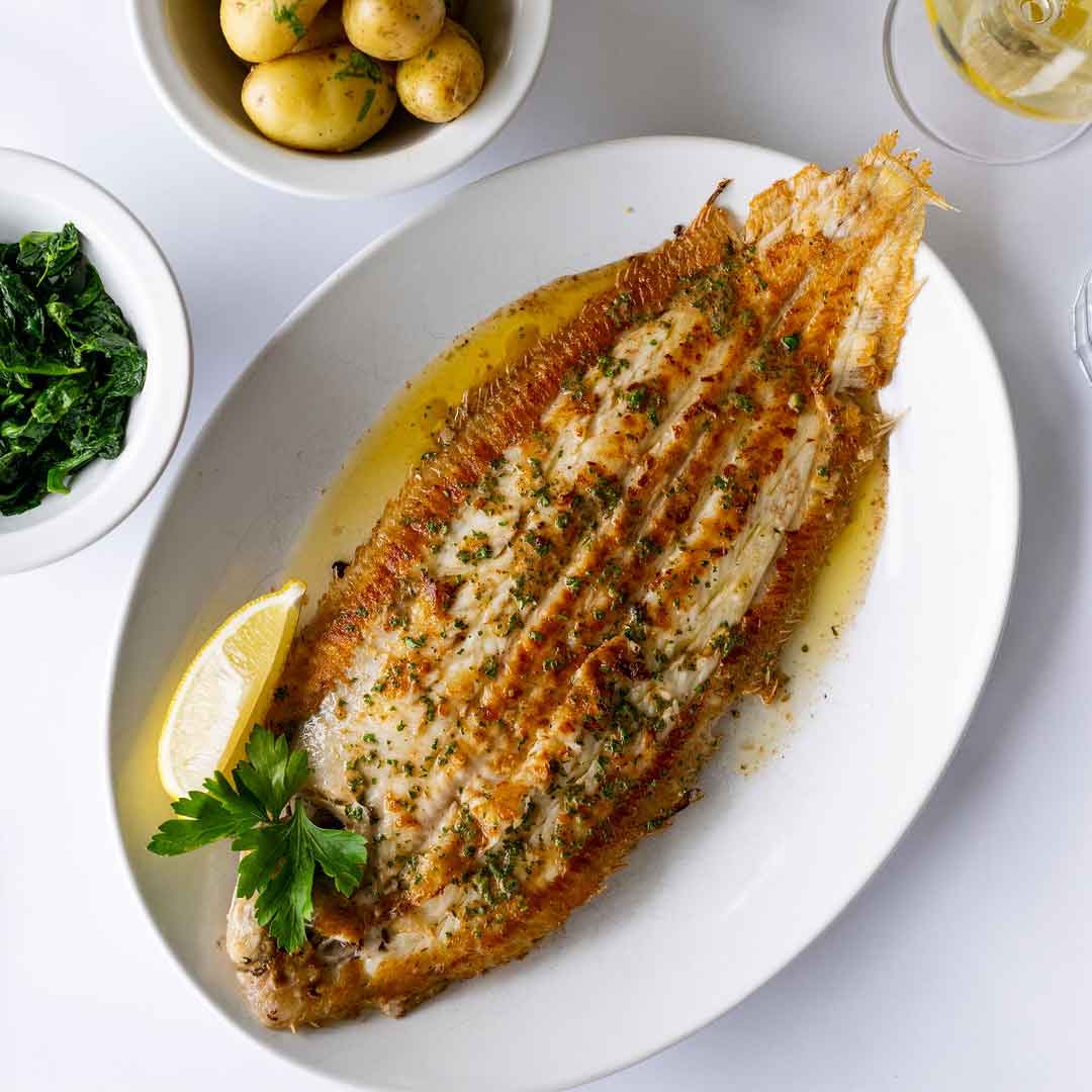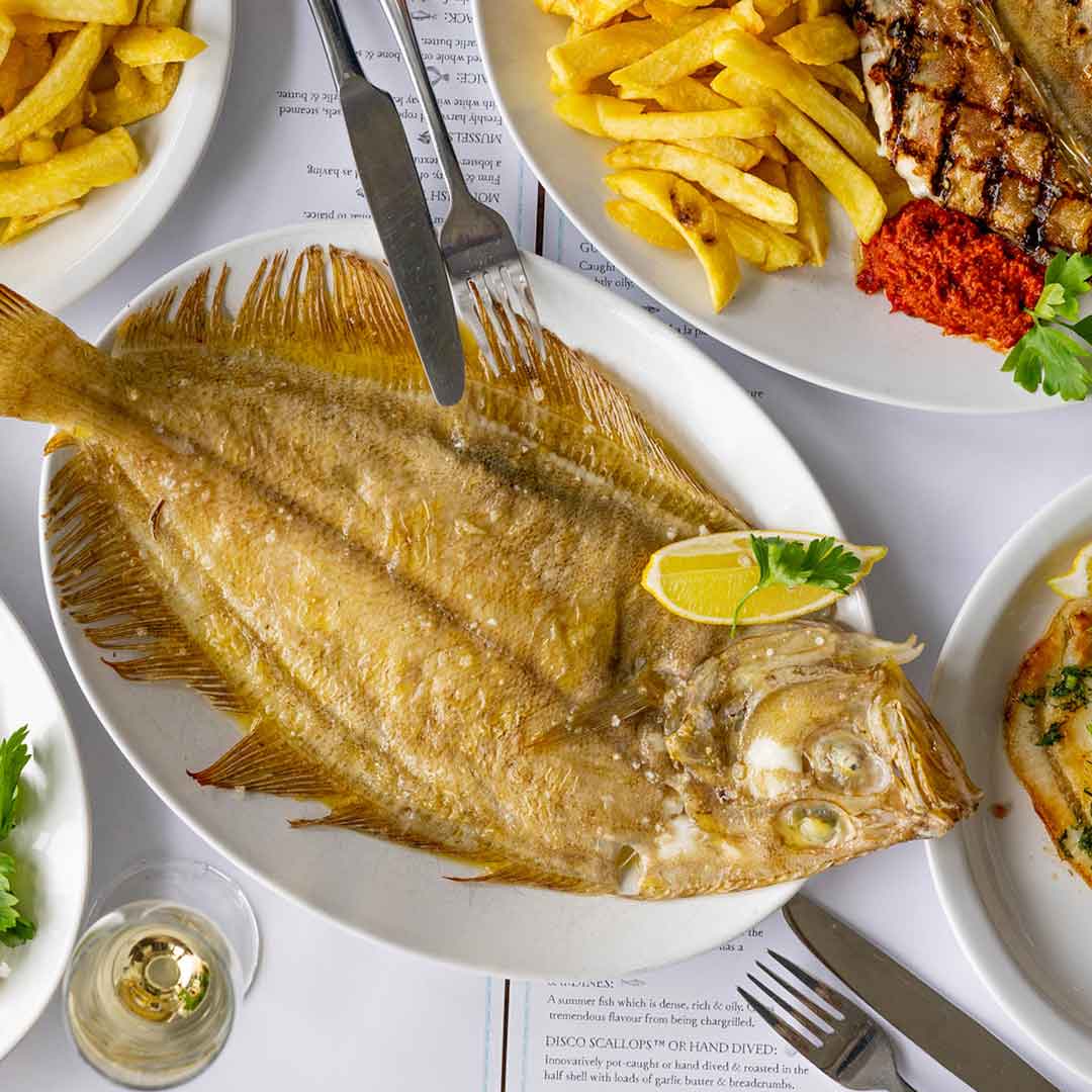 Our team will also mark on the menu today's availability and prices of market fish from our list of seasonal, sustainably caught seafood and shellfish. This will be led by what has been landed by the fleet in Brixham that morning. Your choice of fresh fish will then be cooked to order and served with your choice of Cornish new potatoes, a green salad or unlimited chips.